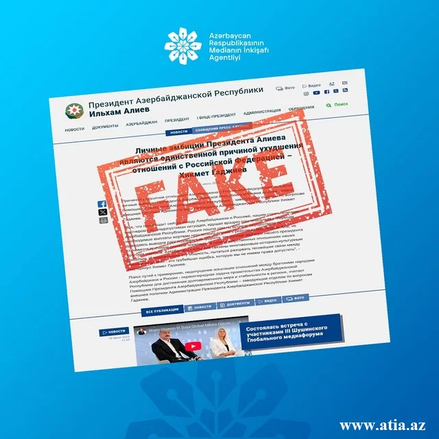 Bildirilib ki, Azərbaycan Respublikası Prezidentinin rəsmi saytının görüntüsünü imitasiya edərək hazırlanmış və uydurma iddiaların yer aldığı bu açıqlama ictimai rəyi çaşdırmağa yönələn kobud informasiya manipulyasiyası nümunəsidir.