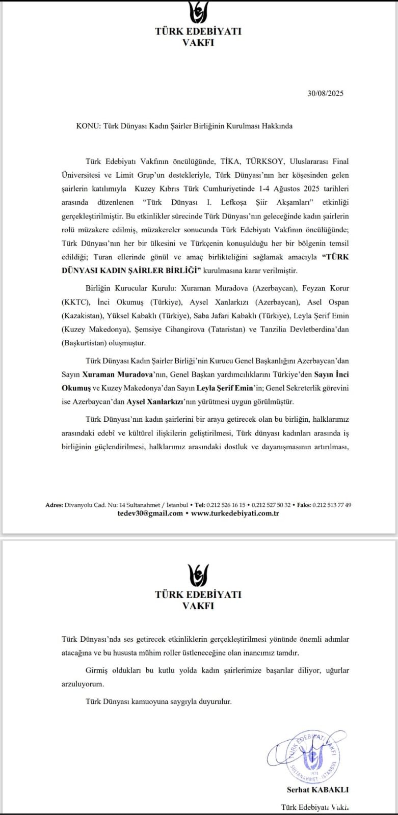“Türk Dünyası Qadın Şairlər Birliyi”nin yaradılması ilə bağlı qərar bu il avqustun 1-dən 4-dək Şimali Kipr Türk Cümhuriyyətində keçirilən “Türk Dünyası I Lefkoşa Şeir Axşamları” çərçivəsində qəbul edilib.